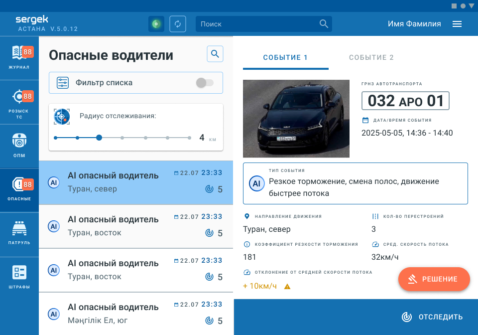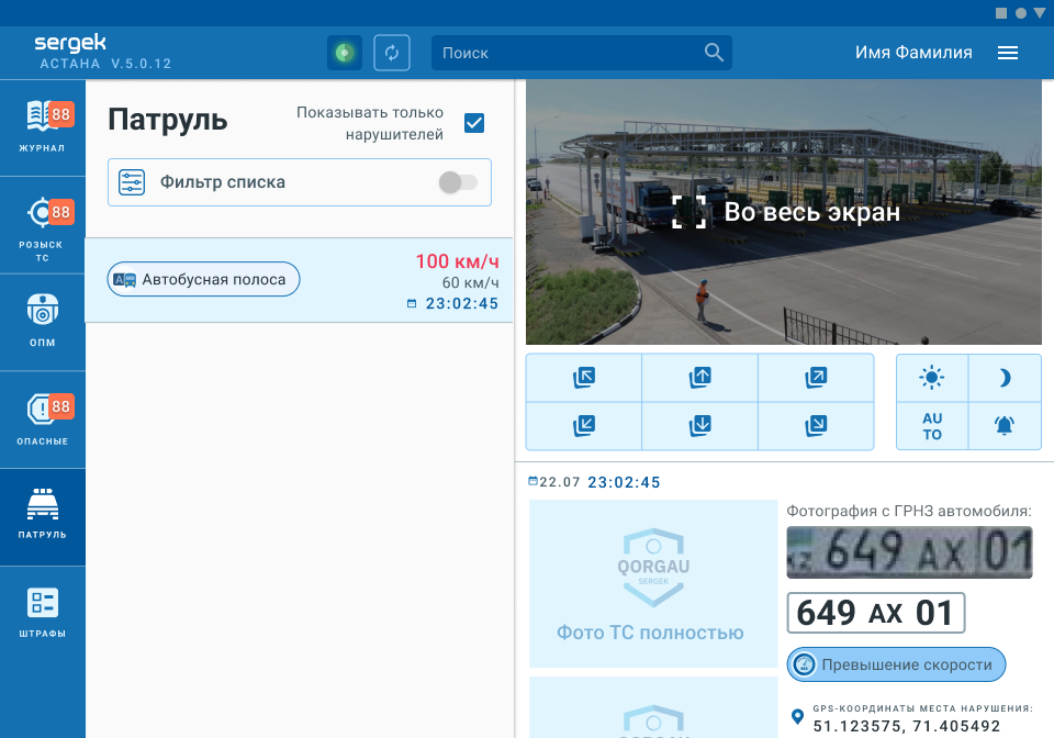 для сотрудников полиции. Мобильное приложение Sergek Qorgau предназначено для сотрудников полиции и служит инновационным инструментом, позволяющим повысить эффективность выявления нарушителей. Оно даёт возможность быстро реагировать на ориентировки и осуществлять поиск транспорта в режиме реального времени, выявлять опасное вождение, проверять нарушения, а также упрощает процесс оперативно-профилактических мероприятий за счёт быстрой выдачи предписаний и внесения данных о неустановленных транспортных средствах.