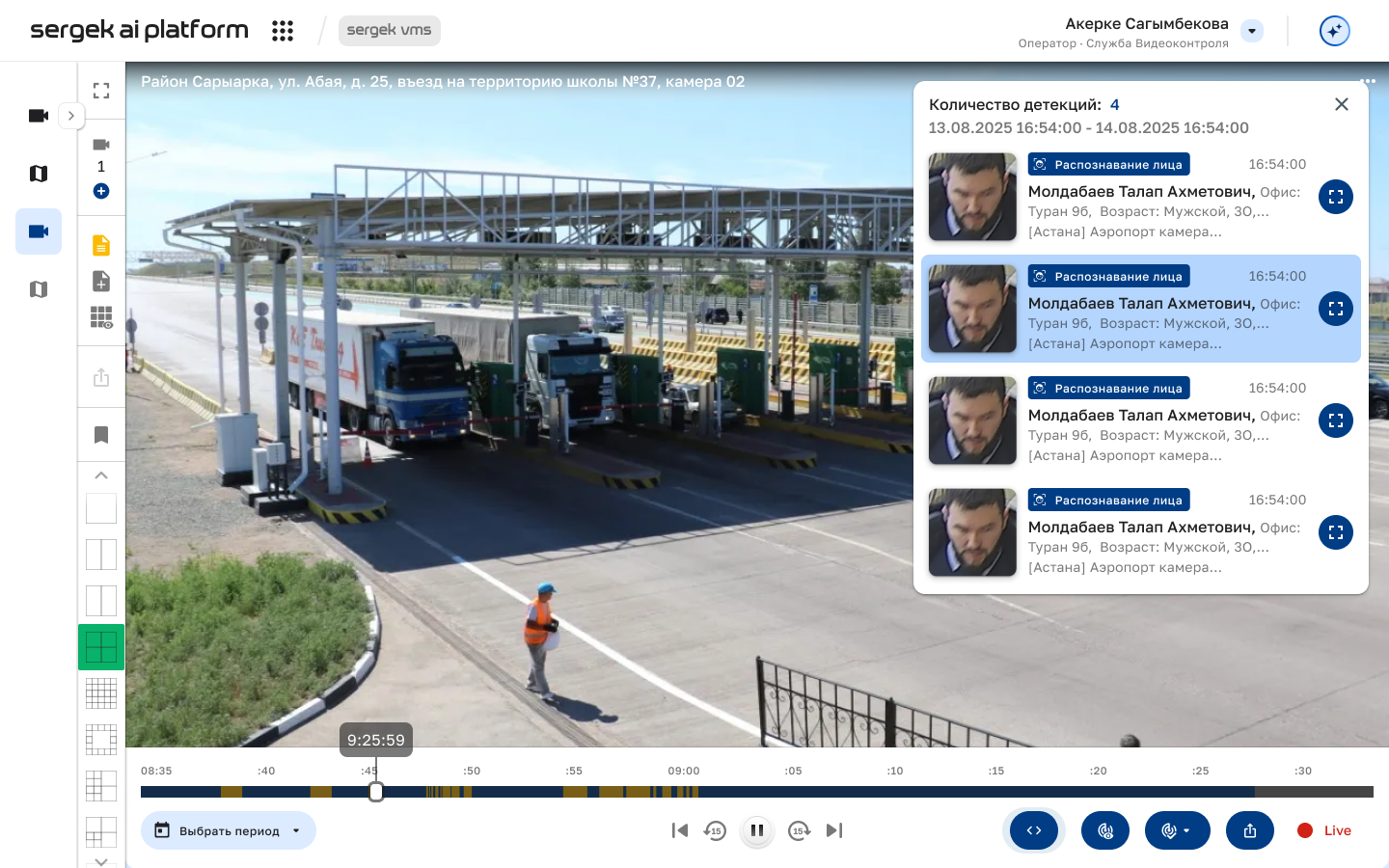 Интеллектуальная система видеонаблюдения и аналитики для обеспечения общественной безопасности. Это комплексная система видеонаблюдения с инструментами аналитики на основе искусственного интеллекта для обеспечения общественной безопасности. Предназначена для обеспечения безопасности на дорогах и улицах городов; детей и студентов в учебных заведениях; местах скопления людей; общественных местах, подвергаемых террористическим угрозам. Сферами фокуса являются Центры управления, общественные места, школы, детские сады и другие учебные заведения, больницы, ЖК, критическая инфраструктура и др.